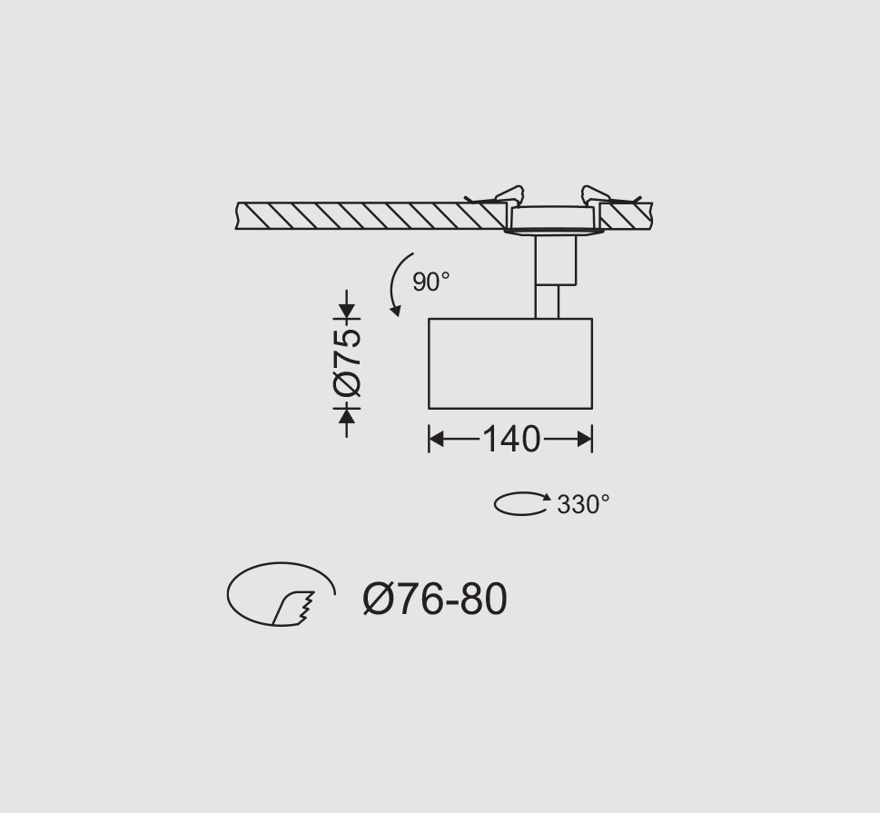 چراغ توکار هانی 20 وات مازی نور به صورت توکار و بر روی سوراخ برش به قطر 76 تا 80 میلیمتر نصب میگردد. اما ابعاد چراغ Ø75×140 میباشد که قطر دهانه چراغ حدود 75 میلیمتر و طول سیلندر چراغ نیز 140 میلیمتر میباشد. به واسطه طراحی خاص چراغ توکار هانی، همانطور که در شکل زیر نمایش داده شده است، میتوان دو نوع چرخش در نور چراغ را به همراه داشت. سر چراغ به صورت عمودی حدود 90 درجه و گردن چراغ در حدود 330 درجه قابلیت چرخش و تنظیم را داراست.