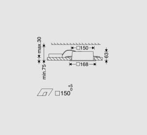 ابعاد این چراغ همانطور که در تصویر نمایش داده شده است، در قسمت رویه: 168 میلیمتر و ضخامت پشت کار 63 میلیمتر میباشد و عرض برش مربع پیشنهادی در روی کار باید 150 میلیمتر باشد.