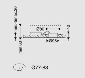 ابعاد چراغ دانلایت گرد توکار 9 وات آریانا همانطور که در تصویر نمایش داده شده است، در قسمت رویه: 96 میلیمتر و ضخامت پشت کار 40 میلیمتر میباشد و قطر برش پیشنهادی در روی کار باید 77 تا 83 میلیمتر باشد.