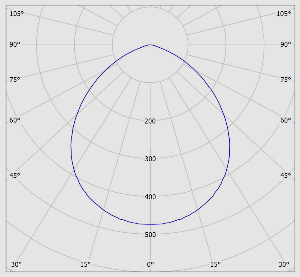 با توجه به استفاده از دیفیوزر از نوع ساتن شیری پلی کربنات، پخش نور این چراغ به صورت متقارن يكنواخت انجام میشود، که منحنی پخش نور این چراغ را در تصویر زیر مشاهده مینمایید: