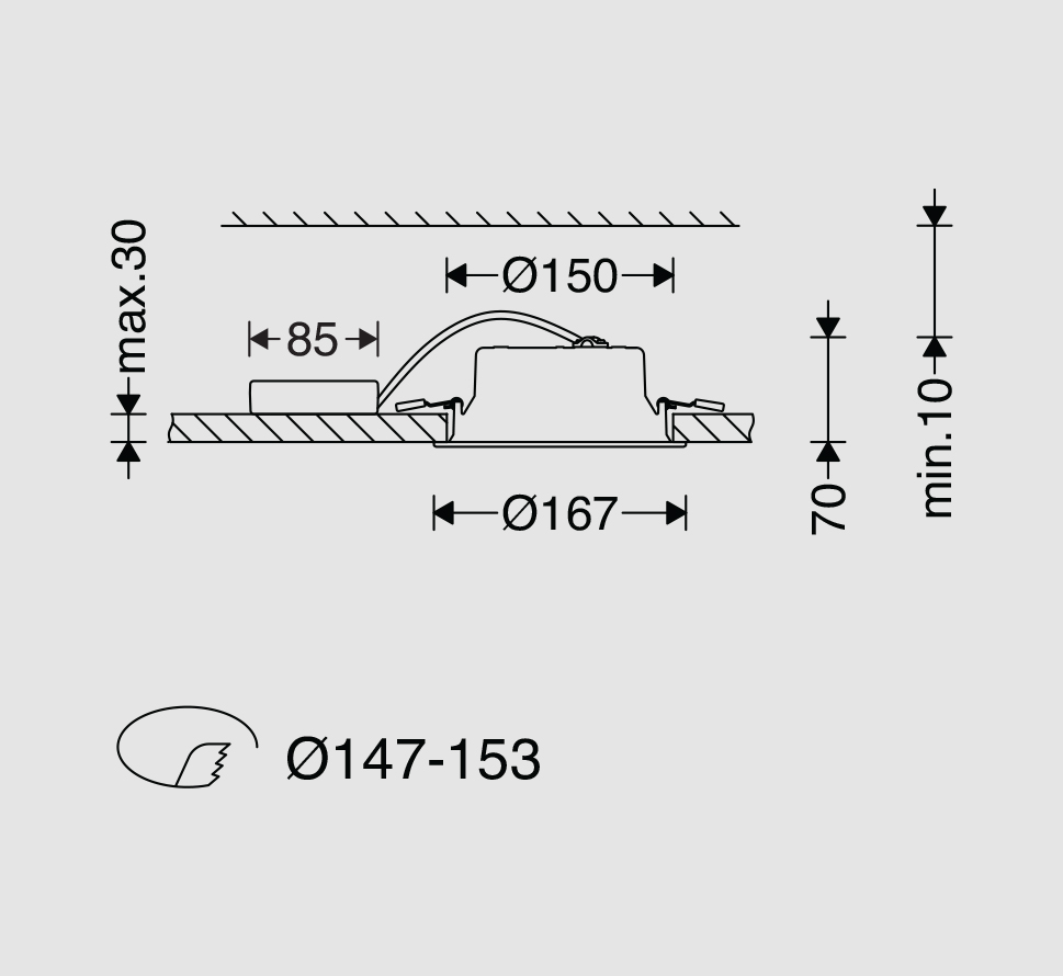 چراغ دانلایت گرد توکار آریانا کامفورت 15 سانتی مازی نور با ابعاد Ø167×73 میلیمتر، نیازمند به برش با قطر 147 تا 153 میلیمتر جهت نصب راحت تر میباشد. همچنین عمق کار این چراغ 70 میلیمتر میباشد.