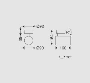 چراغ روکار هانی 9 سانتی مازی نور به صورت روکار و بر روی سوراخ های مخصوص پایه خودش نصب میگردد. اما ابعاد چراغ Ø90×160 میلیمتر میباشد که قطر دهانه چراغ حدود 90 میلیمتر و طول سیلندر چراغ نیز 160 میلیمتر میباشد. به واسطه طراحی خاص چراغ روکار هانی، همانطور که در شکل زیر نمایش داده شده است، میتوان دو نوع چرخش در نور چراغ را به همراه داشت. سر چراغ به صورت عمودی حدود 90 درجه و گردن چراغ در حدود 330 درجه قابلیت چرخش و تنظیم را داراست.