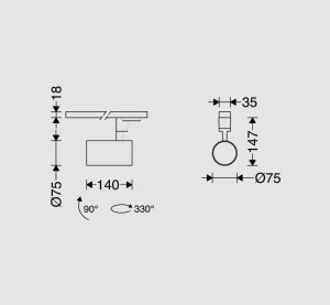 چراغ ریلی 20 وات هانی 7.5 سانتی تک فاز مازی نور به صورت روکار و بر روی ریل های مخصوص نصب میگردد. اما ابعاد چراغ Ø75×140 میباشد که قطر دهانه چراغ حدود 75 میلیمتر و طول سیلندر چراغ نیز 140 میلیمتر میباشد. به واسطه طراحی خاص چراغ ریلی هانی، همانطور که در شکل زیر نمایش داده شده است، میتوان دو نوع چرخش در نور چراغ را به همراه داشت. سر چراغ به صورت عمودی حدود 90 درجه و گردن چراغ در حدود 330 درجه قابلیت چرخش و تنظیم را داراست.