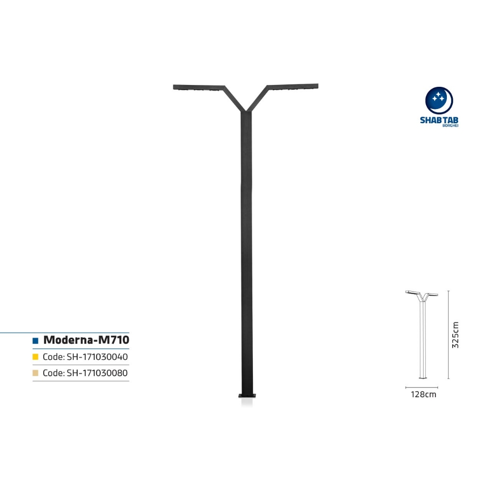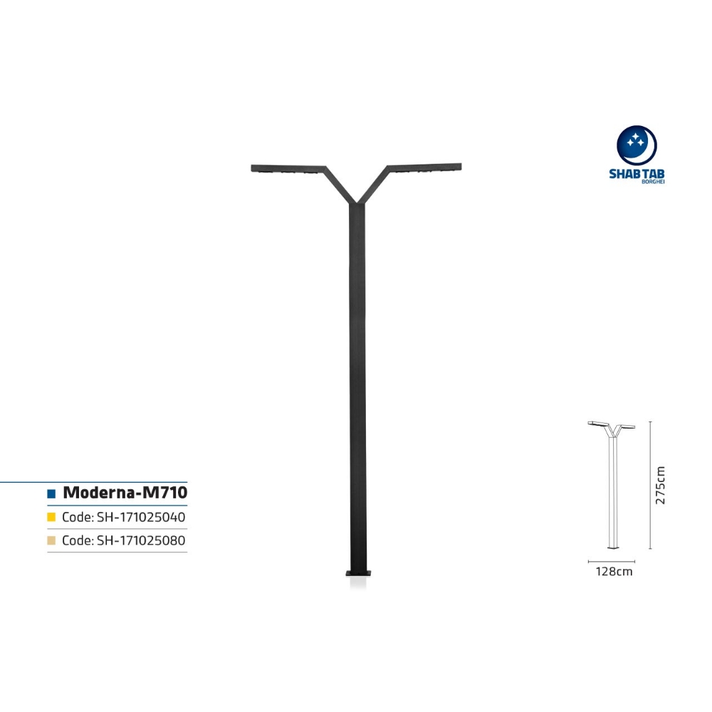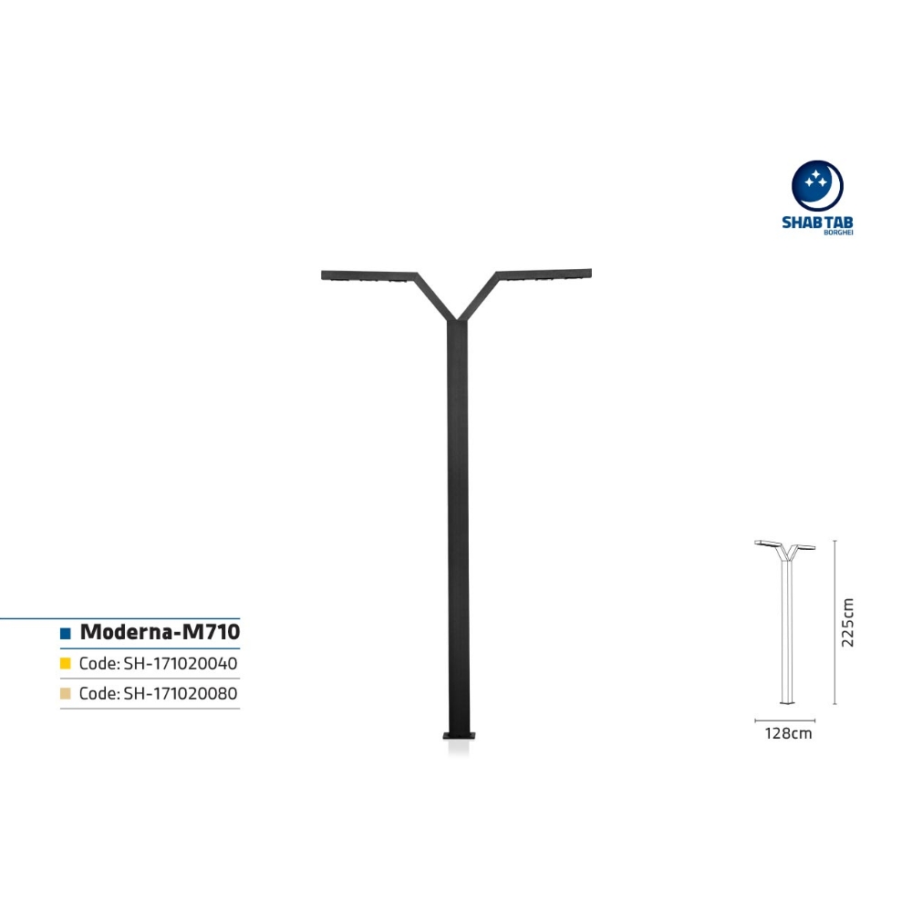چراغ مدرنا-‏M710‎‏ به عنوان چراغ خیابانی به کار می‌رود. شما می‌توانید این محصول را در سایزهای 2 متری، ‏‏2.5 متری و 3 متری سفارش دهید. برای ثبت سفارش با نمایندگی شهرخود تماس بگیرید.‏