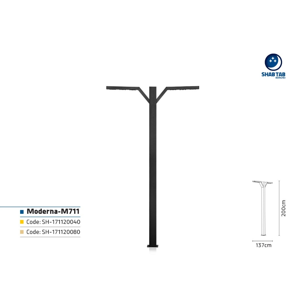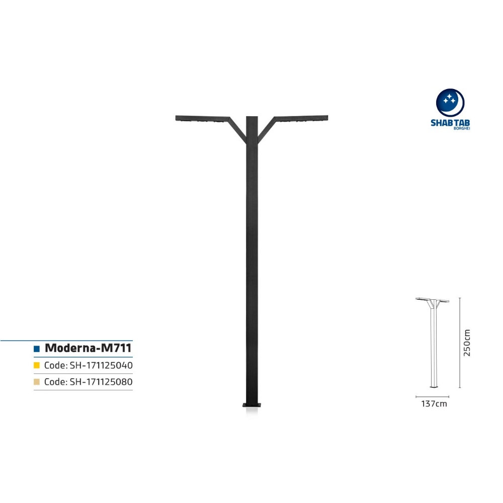 چراغ مدرنا-‏M711‎‏ در دسته انواع چراغ‌های خیابانی است که با طراحی مدرن روانه بازار شده است. شما ‏می‌توانید برحسب نیاز خود این محصول را در سه ارتفاع 2 متر، 2.5 متر و 3 متر خریداری نمایید. برای ثبت ‏سفارش از طریق نمایندگی شهر خود اقدام کنید.‏