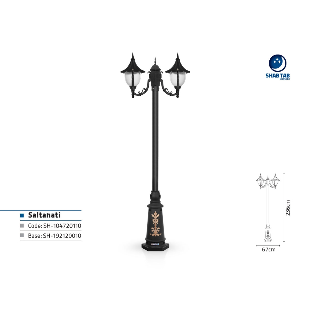 چراغ پارکی سلطنتی دو شاخه کلاسیک پایه ارغوان – یکی از چراغ های محوطه ای زیبا و ظریف شب تاب چراغ سلطنتی است که طراحی خاص و منحصر به فردی دارد. چراغ سلطنتی کلاهکی دارد علاوه بر جذابیت، جلوی هدررفت نور را از سمت بالا می گیرد و دیزاینی کاملا خاص دارد. چراغ سلطنتی شب تاب در پنج مدل چراغ دیواری، چراغ پارکی، چراغ سرلوله، چراغ آویز و چراغ سردری تولید می شود که تمامی نیازهای شما را برای چراغ های محوطه پاسخ می گوید. چراغ سلطنتی را می توانید با شاخه های سناتور، کلاسیک و پایه های ترنج و صنوبر نصب کنید و از جذابیت آن لذت ببرید.