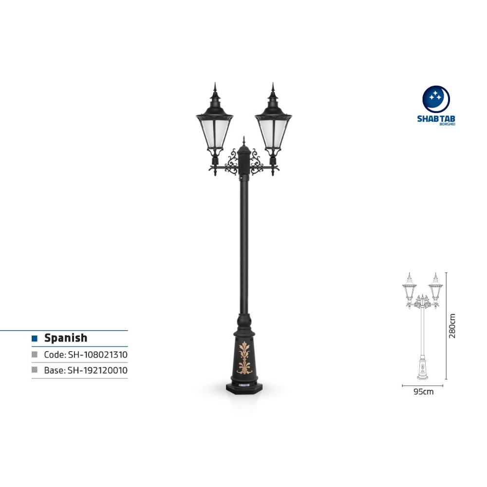 چراغ پارکی شب تاب اسپانیایی دو شاخه رز پایه ارغوان – هر فضایی سبک معماری مشخص و تعریف شده ای دارد و هنگامی که می خواهید المان خاصی به آن اضافه کنید حتی اگر نقش تزیینی و دکوراتیو داشته باشد باید سبک مشابه آن را خریداری کنید. چراغ ها به عنوان المان روشنایی بخش محیط داخلی و بیرونی اهمیت بسیار فراوانی دارند و در محیط هایی که سبک معماری آنها کلاسیک است جای خالی چراغی مثل چراغ اسپانیایی شب تاب برقعی به خوبی احساس می شود. چراغ اسپانیایی شب تاب با سبک کلاسیک و زیبایی خاص خود سلیقه های زیادی را پوشش داده است.