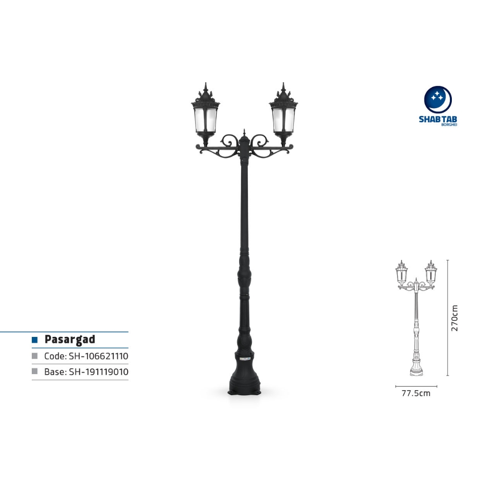 چراغ پارکی شب تاب پاسارگاد سارینا افرا دو شاخه – از آنجایی که تاریخ هنر کهن ایرانی با نبوغ، نظم و اصالت گره خورده، شنیدن هر نام و یادی از آن، همواره ذهن ما را به سمت شکوه و زیبایی می‌اندازد. چراغ‌های صنایع روشنایی شب‌تاب نیز از پروسه‌ی ایده‌پردازی تا طراحی و تولید محصول وام‌دار و البته وفادار به اصالت نامی هستند که به آن شناسایی می‌شوند. چراغ محوطه‌ای پاسارگاد، یکی از خاص‌ترین چراغ‌های این مجموعه است که تمامی فاکتورهای محبوبیت را در خود دارد.